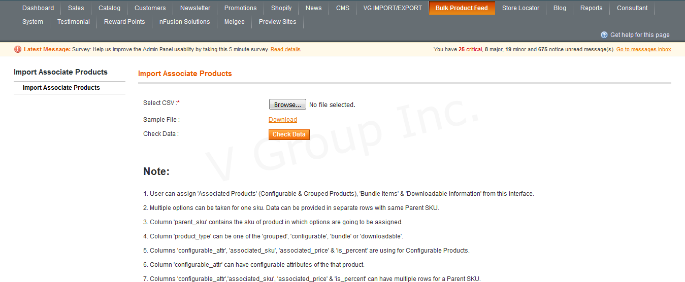 Bulk Product Feed Extension by V Group helps merchants to Import and Export the Products store wise along with their Custom options, associated products, bundled items, downloadable information and grouped products in bulk through CSV file. Merchant can import and export the product information such as Store information, Categories, SKU, Price, Qty, Name, Description, Status, Special Price, Wright, Meta Information, Images, URL Key, Visibility, Page Layout, Custom Layout Update, Tax Class id, Price type, SKU type, Weight type, Shipment type, Size, Attribute Set id, Type id etc. With the help of our extension Merchant can easily Export and Import their Products store wise along with their Custom options, associated products, bundled items, downloadable information and grouped products.